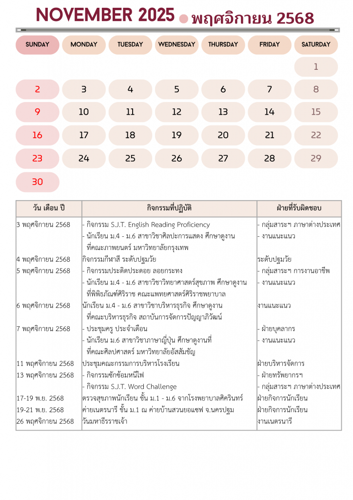 ค่าเรียนพิเศษ(วันเสาร์) ระดับปฐมวัย – มัธยมศึกษาปีที่ 6